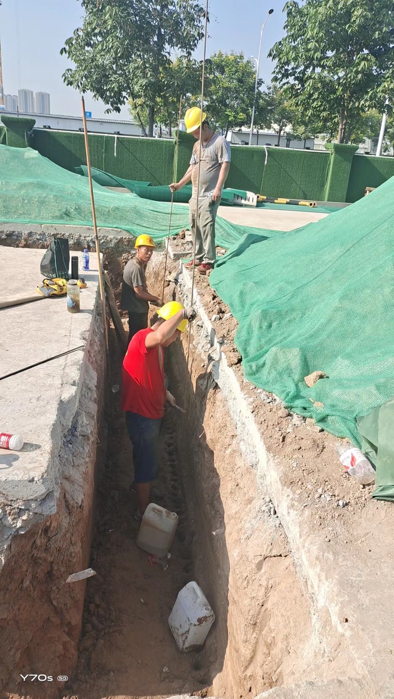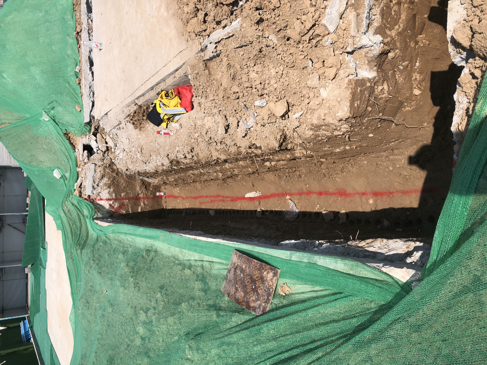 施工前沿維護結構及管線開挖范圍內(nèi)進行人工開挖管線探槽,探槽深度不小于2m。探槽底采用洛陽鏟鉆孔法探查,探孔呈矩形布置,孔間凈距(中到中)0.1m,孔深6m,做到“寧可多探,不可遺漏”。